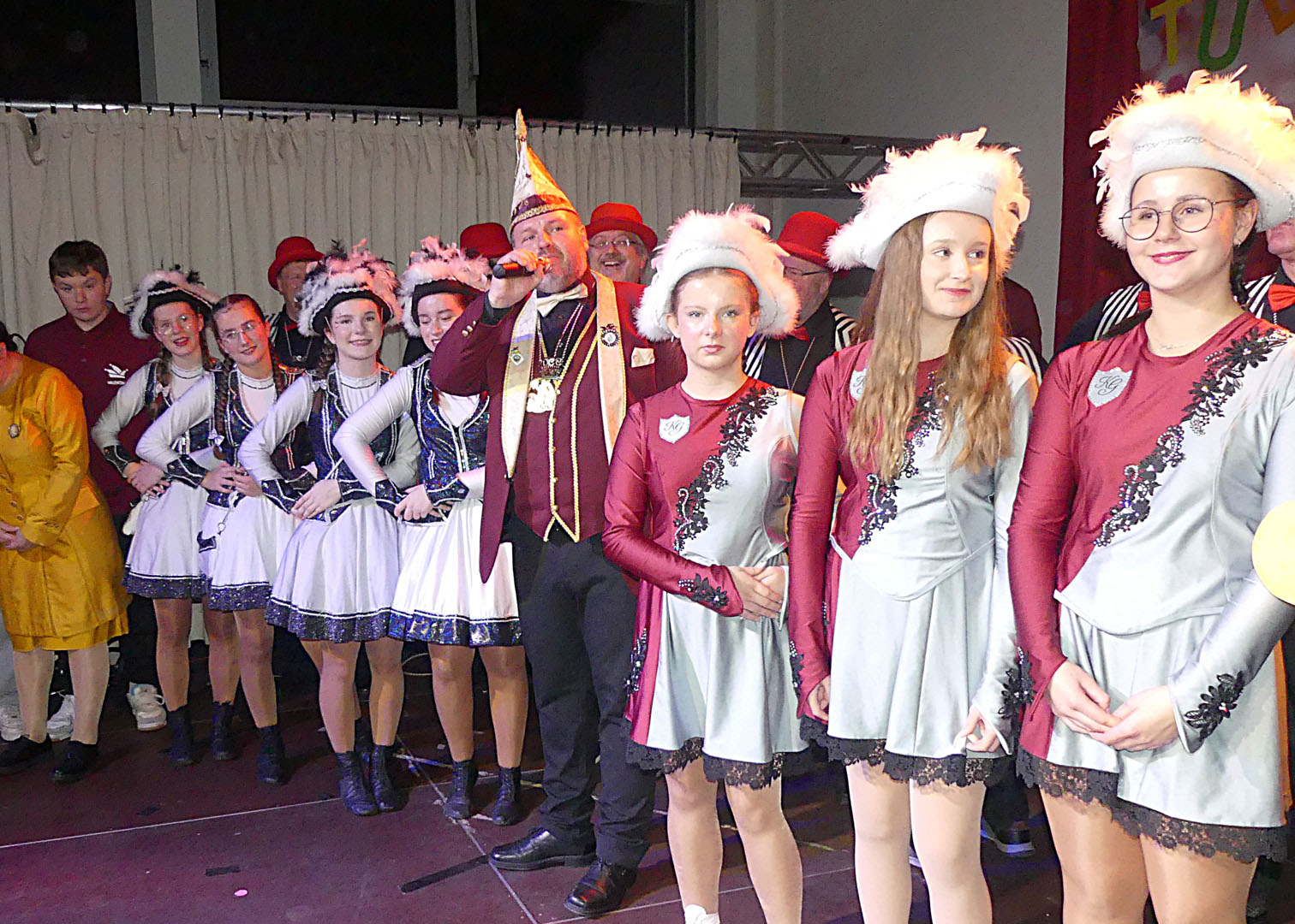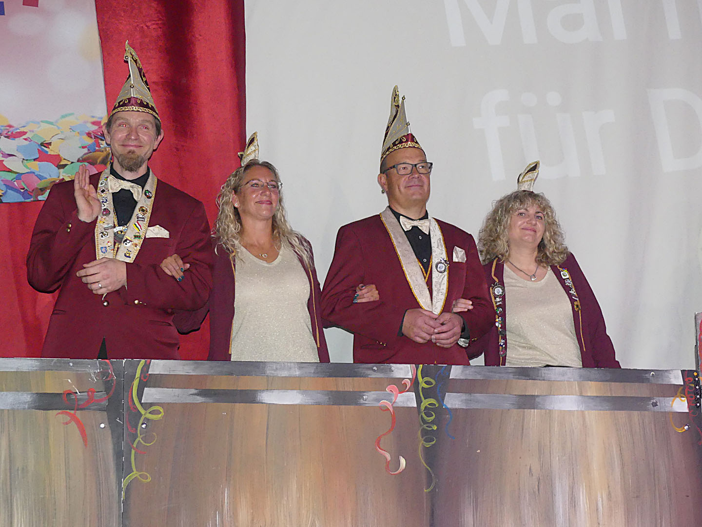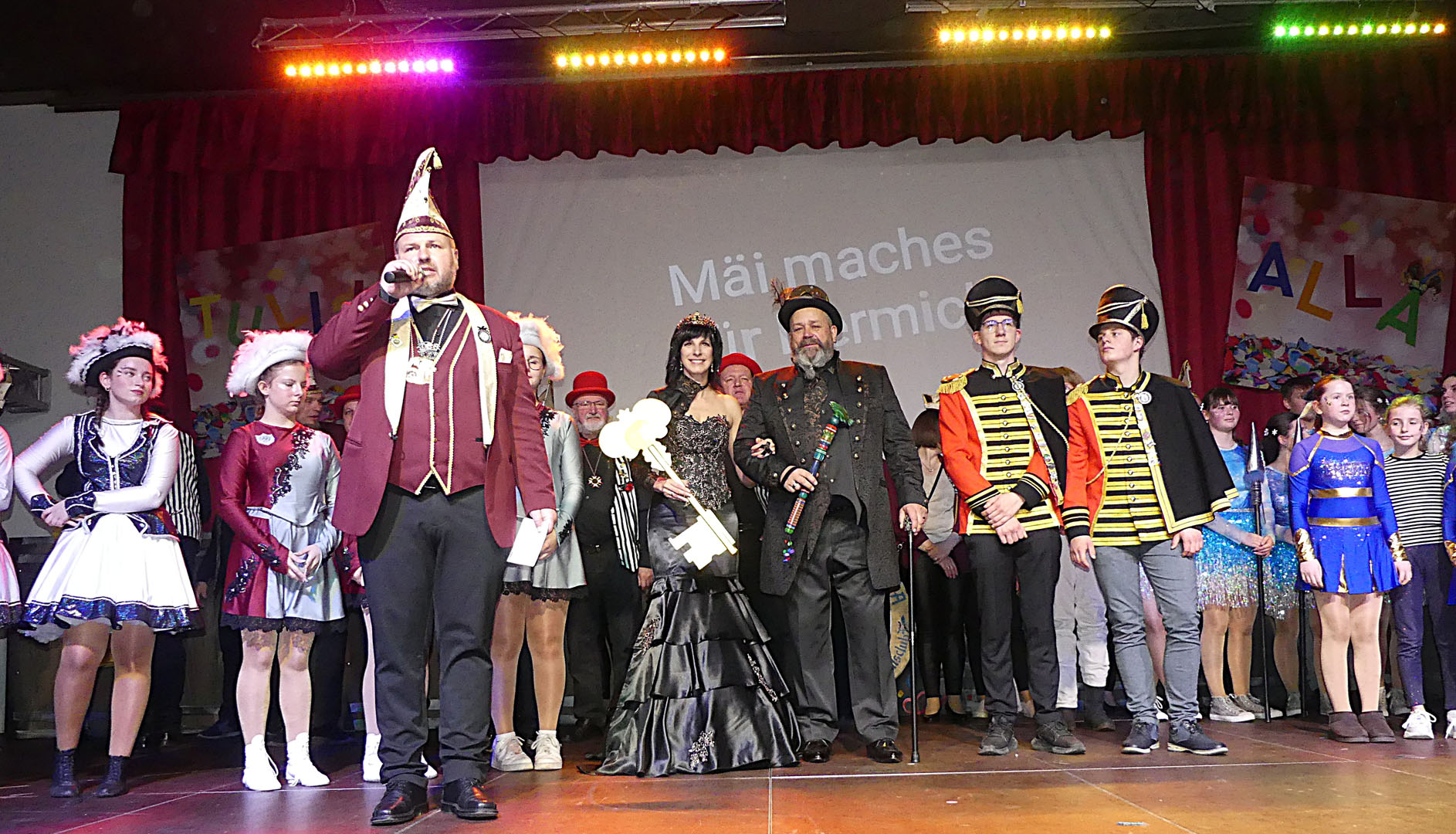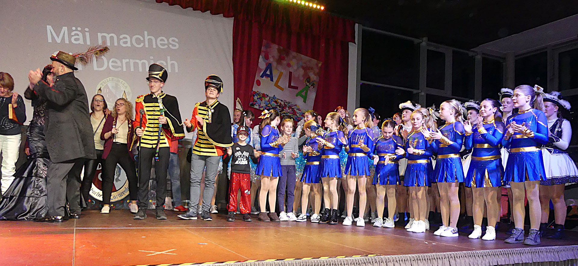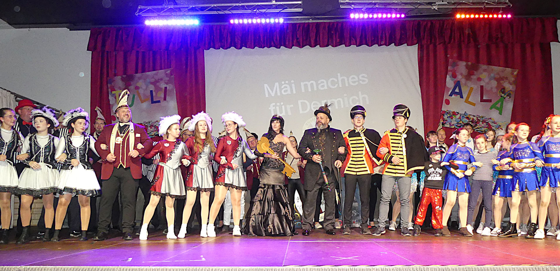 Ein ganz besonderer Höhepunkt war die Vorstellung unseres neuen Prinzenpaares. Mit einem spektakulären Einzug auf Motorrädern, begleitet von rockigen Klängen und Nebeleffekten, präsentierten wir voller Stolz Prinz Henri I. vom Heckicht und Prinzessin Denise II. vom Klambeshof. Die beiden wurden vom Publikum begeistert empfangen, und ihr sympathischer erster Auftritt machte deutlich, dass sie unsere neue Saison mit viel Freude und Energie gestalten werden. Passend dazu stellten wir auch unser Motto vor: „Mäi mâches für Dermich!“ – eine Hommage an die Heimat des neuen Prinzenpaares in den Albadörfern.