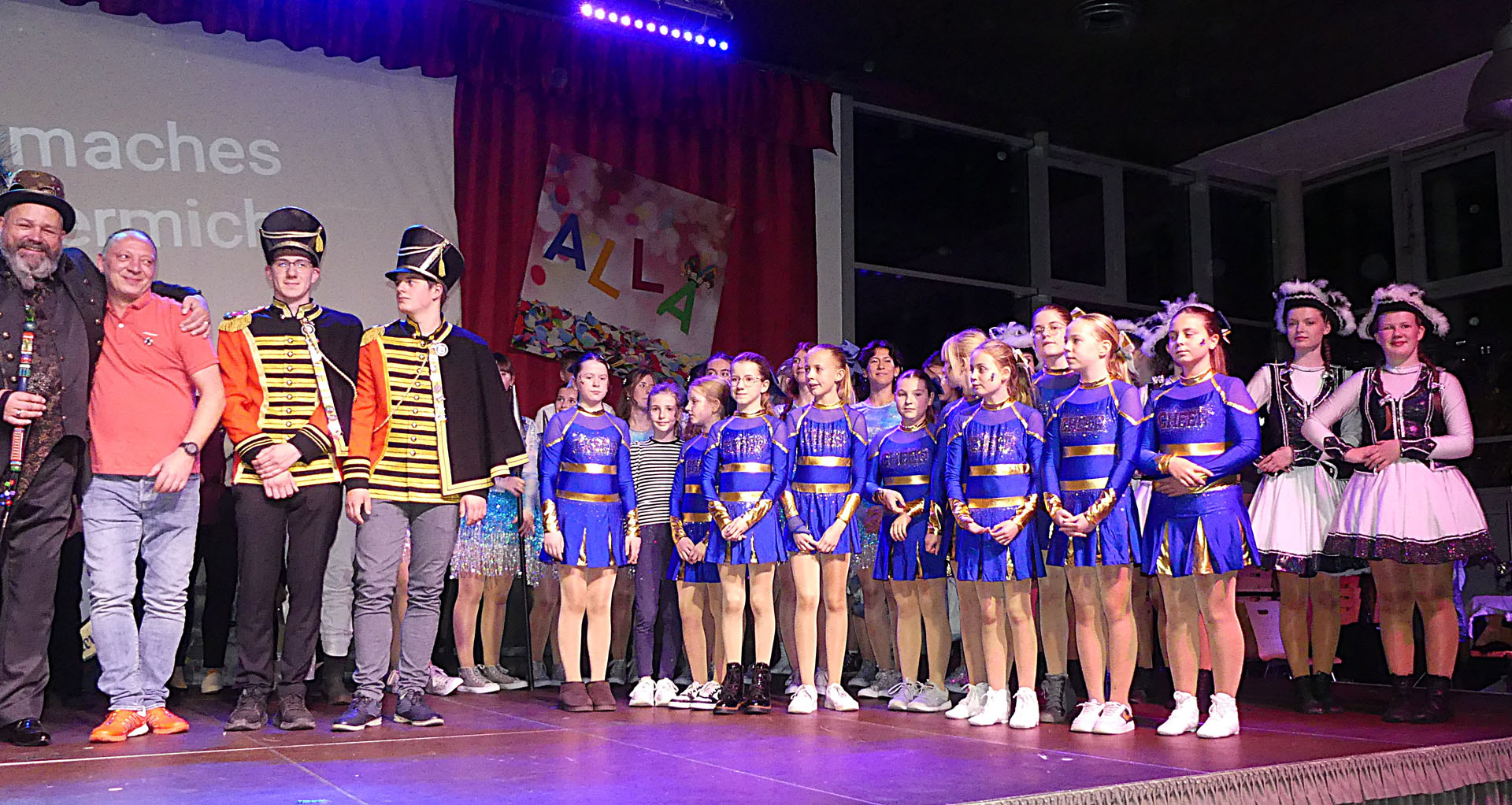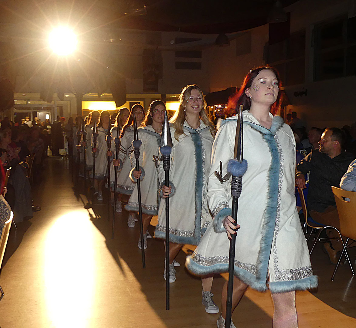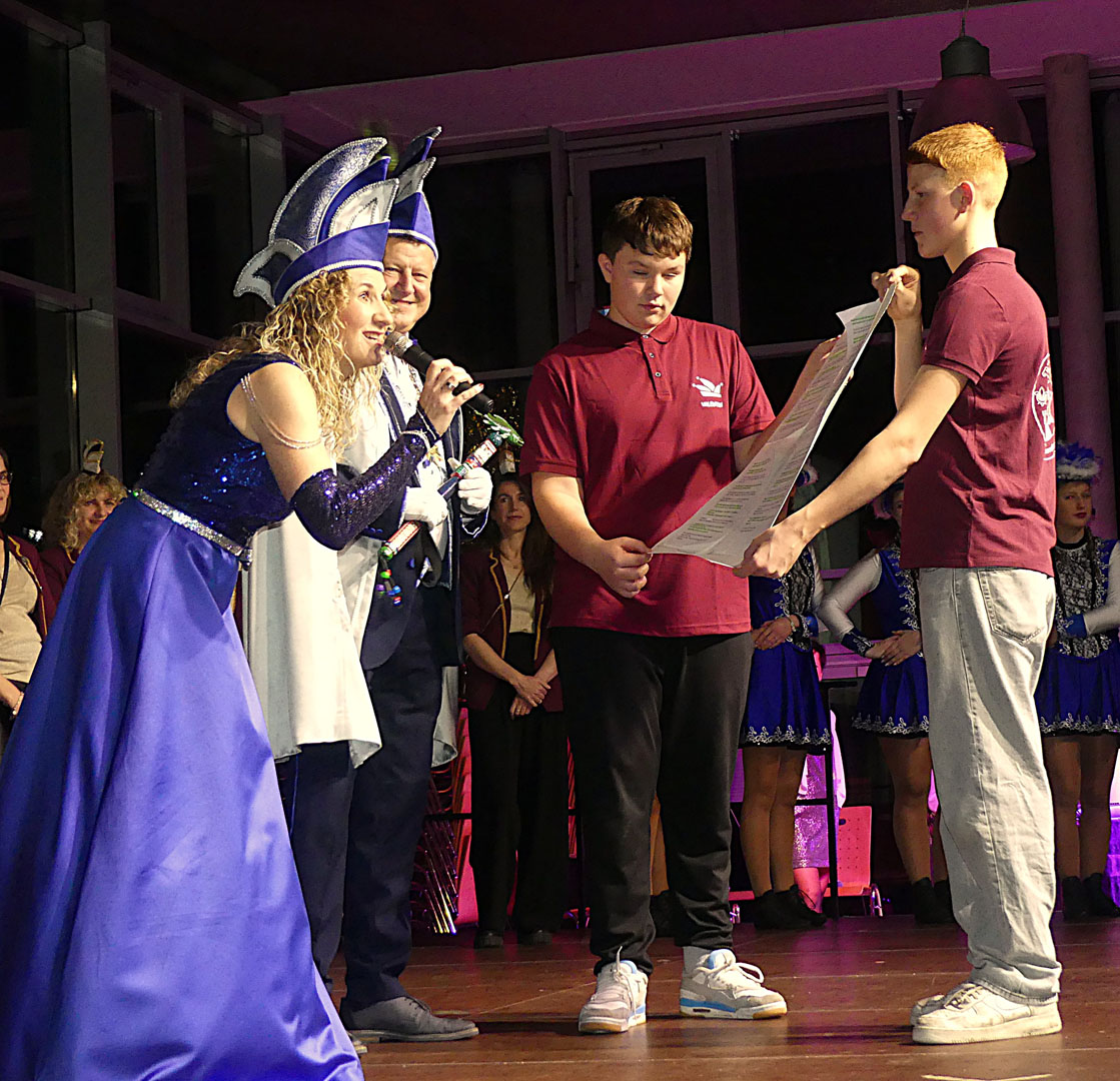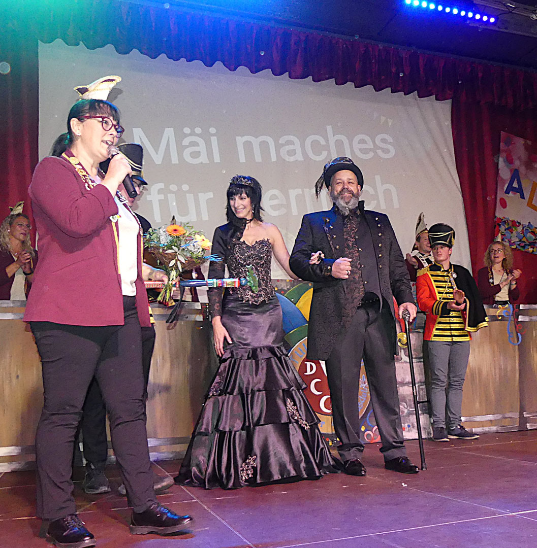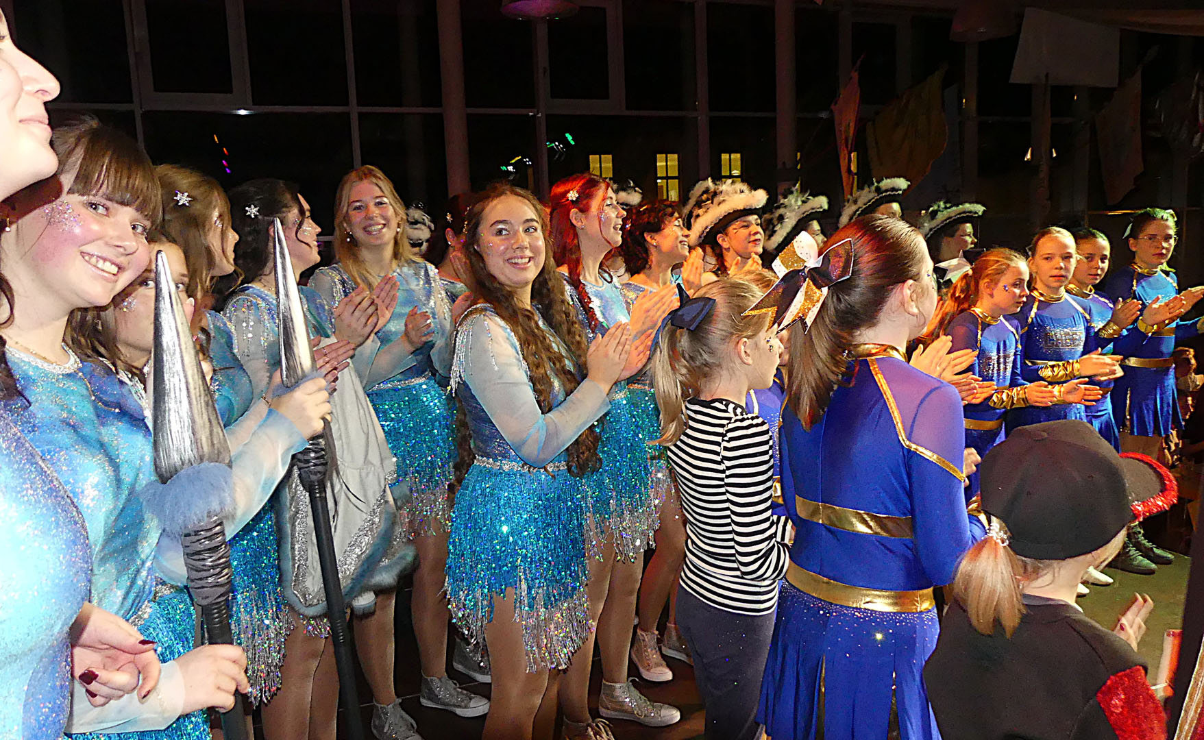 Ein ganz besonderer Höhepunkt war die Vorstellung unseres neuen Prinzenpaares. Mit einem spektakulären Einzug auf Motorrädern, begleitet von rockigen Klängen und Nebeleffekten, präsentierten wir voller Stolz Prinz Henri I. vom Heckicht und Prinzessin Denise II. vom Klambeshof. Die beiden wurden vom Publikum begeistert empfangen, und ihr sympathischer erster Auftritt machte deutlich, dass sie unsere neue Saison mit viel Freude und Energie gestalten werden. Passend dazu stellten wir auch unser Motto vor: „Mäi mâches für Dermich!“ – eine Hommage an die Heimat des neuen Prinzenpaares in den Albadörfern.