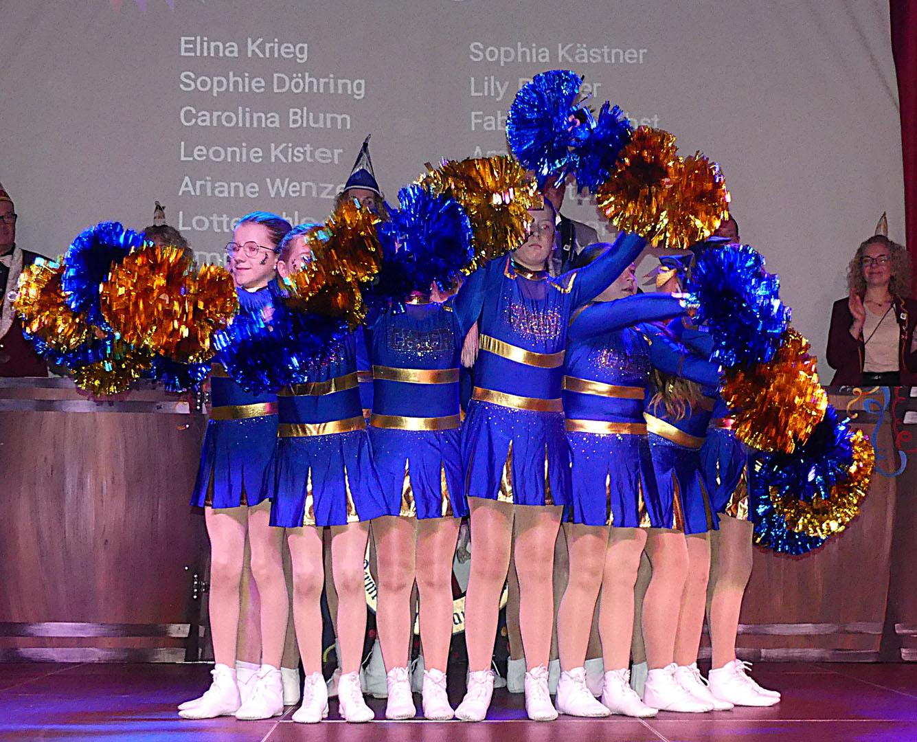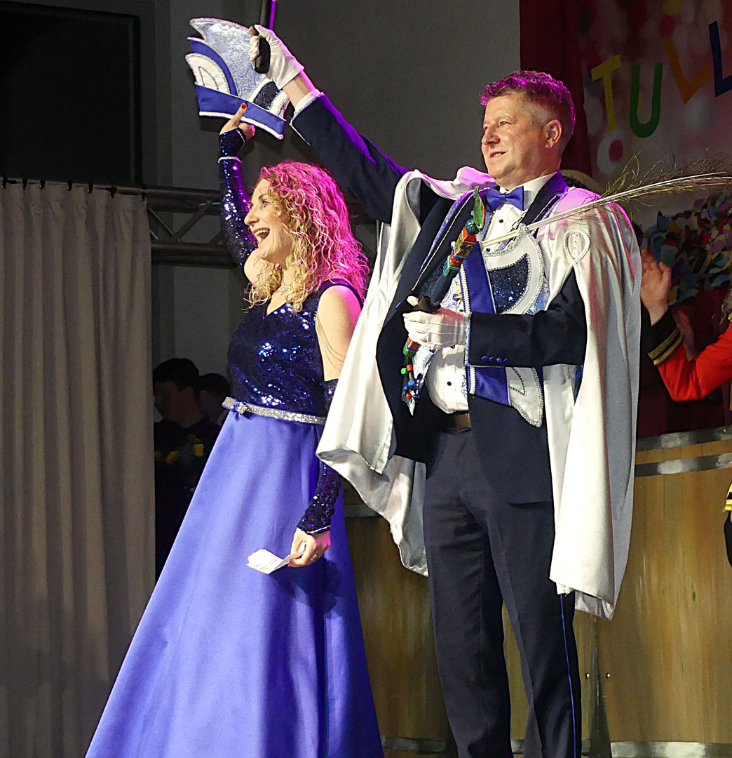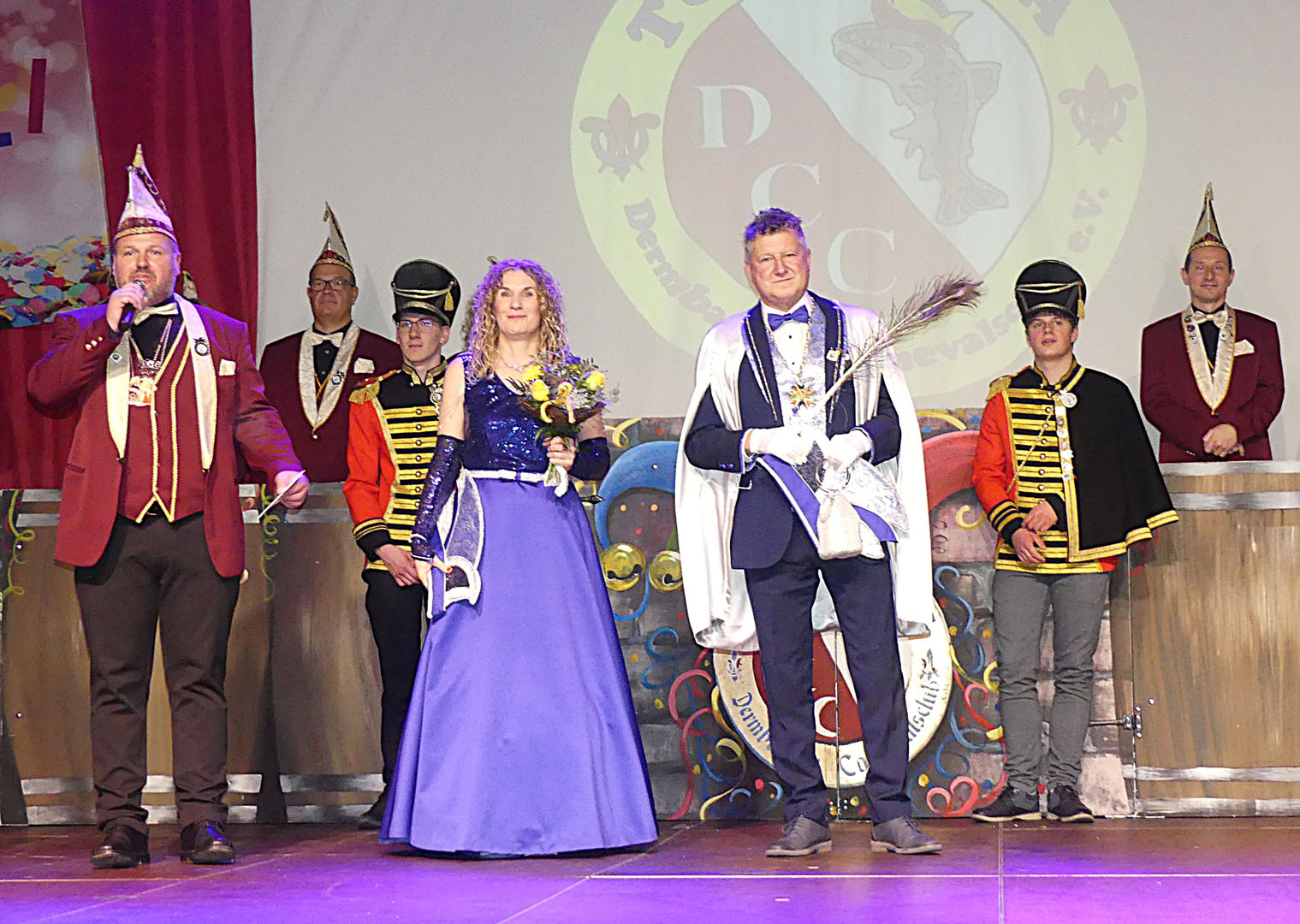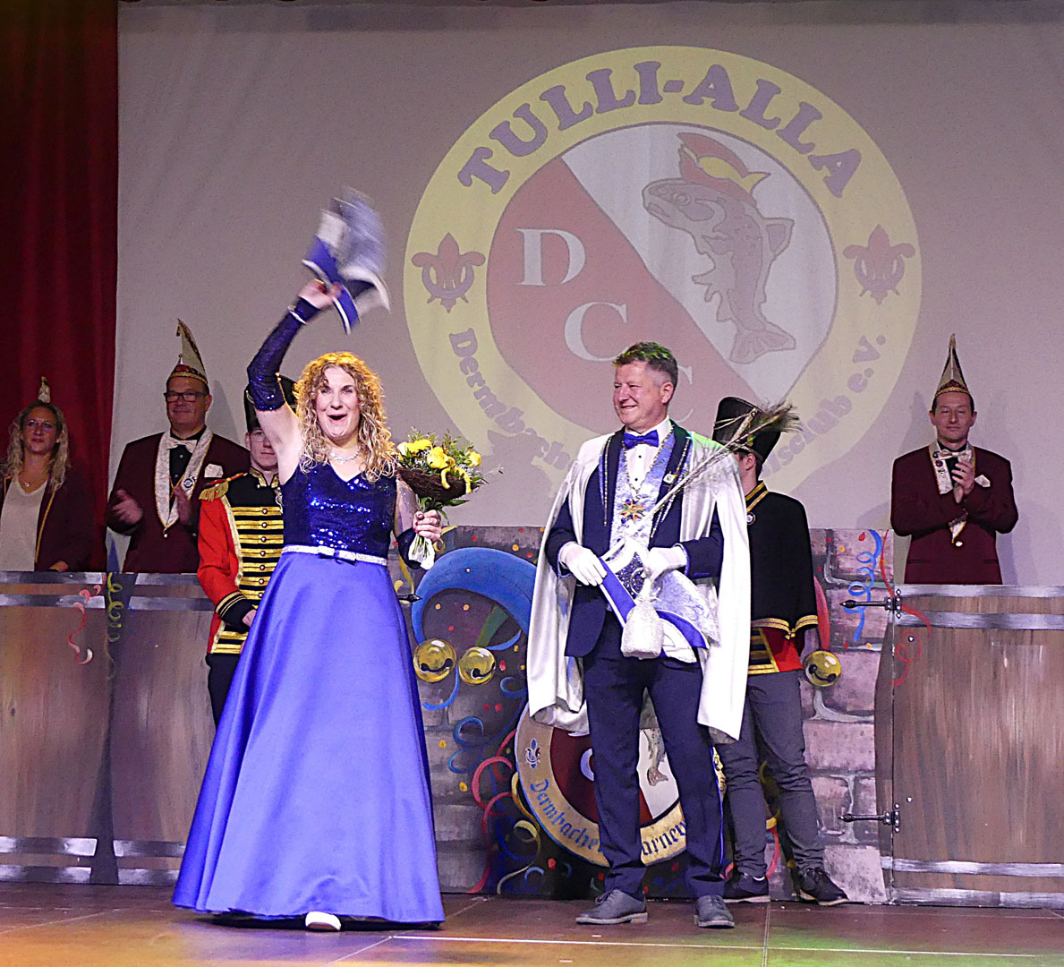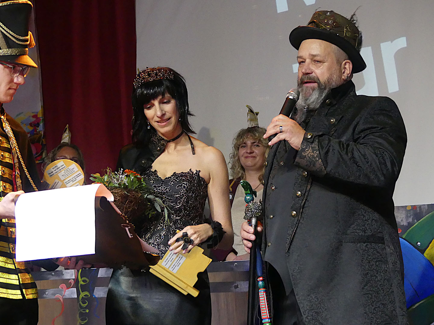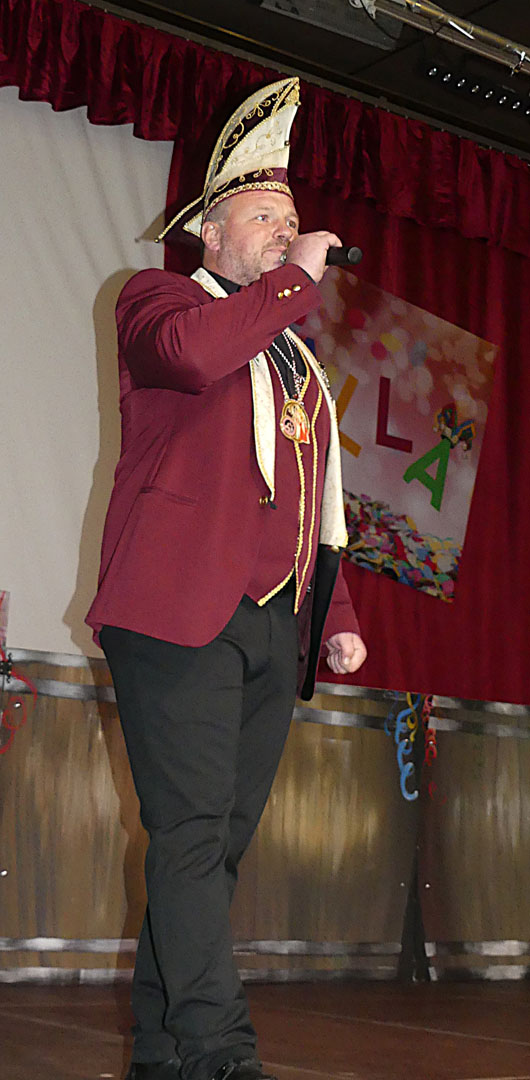 Ein ganz besonderer Höhepunkt war die Vorstellung unseres neuen Prinzenpaares. Mit einem spektakulären Einzug auf Motorrädern, begleitet von rockigen Klängen und Nebeleffekten, präsentierten wir voller Stolz Prinz Henri I. vom Heckicht und Prinzessin Denise II. vom Klambeshof. Die beiden wurden vom Publikum begeistert empfangen, und ihr sympathischer erster Auftritt machte deutlich, dass sie unsere neue Saison mit viel Freude und Energie gestalten werden. Passend dazu stellten wir auch unser Motto vor: „Mäi mâches für Dermich!“ – eine Hommage an die Heimat des neuen Prinzenpaares in den Albadörfern.