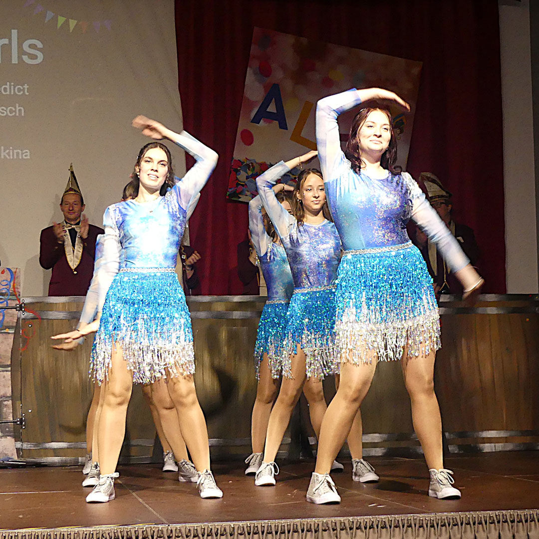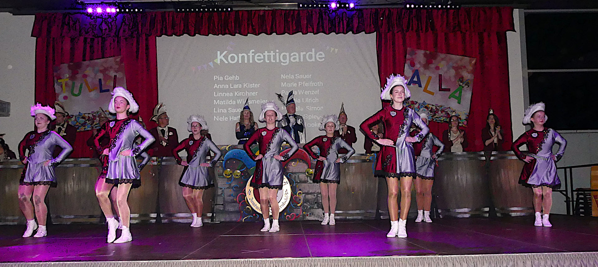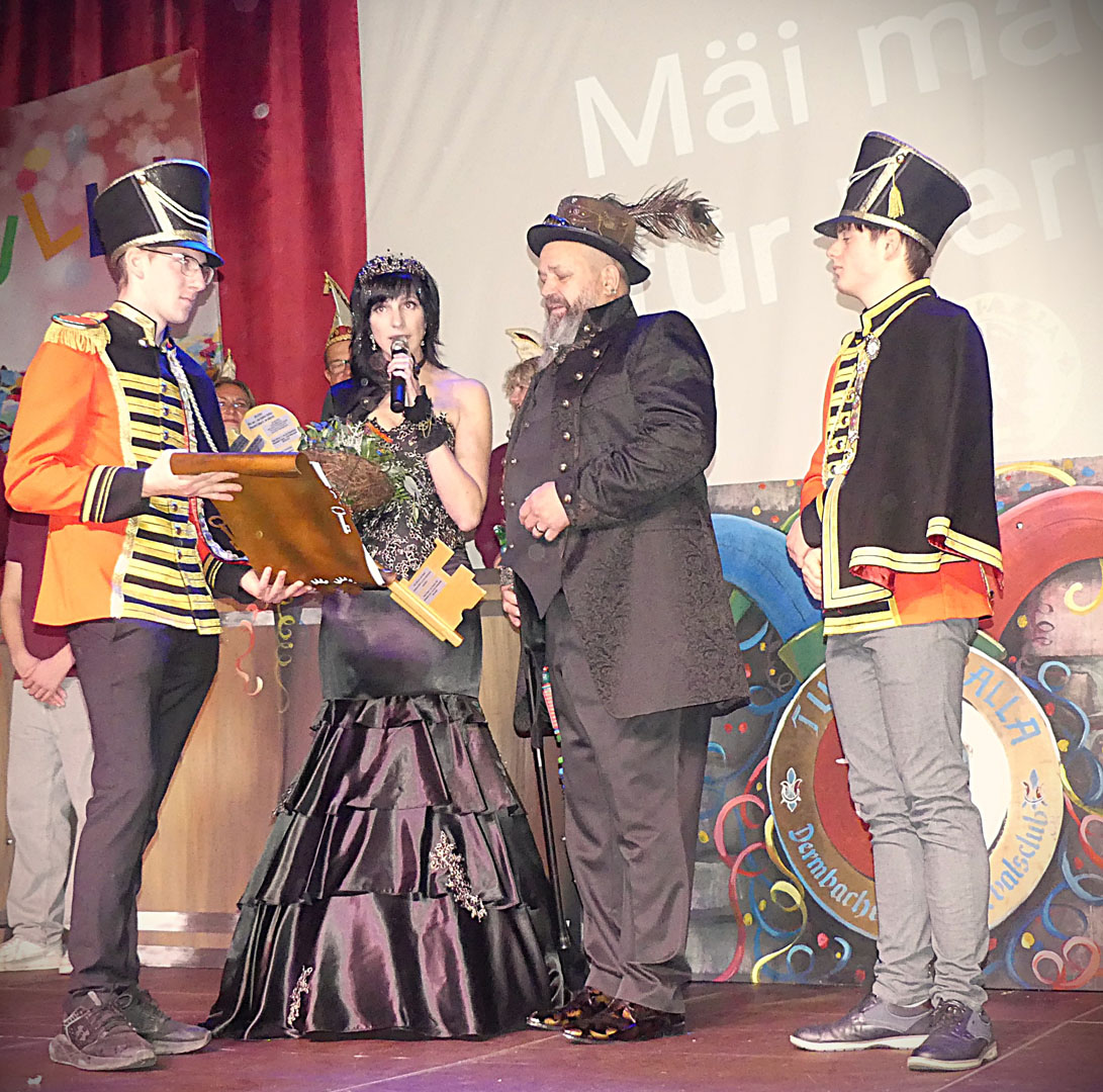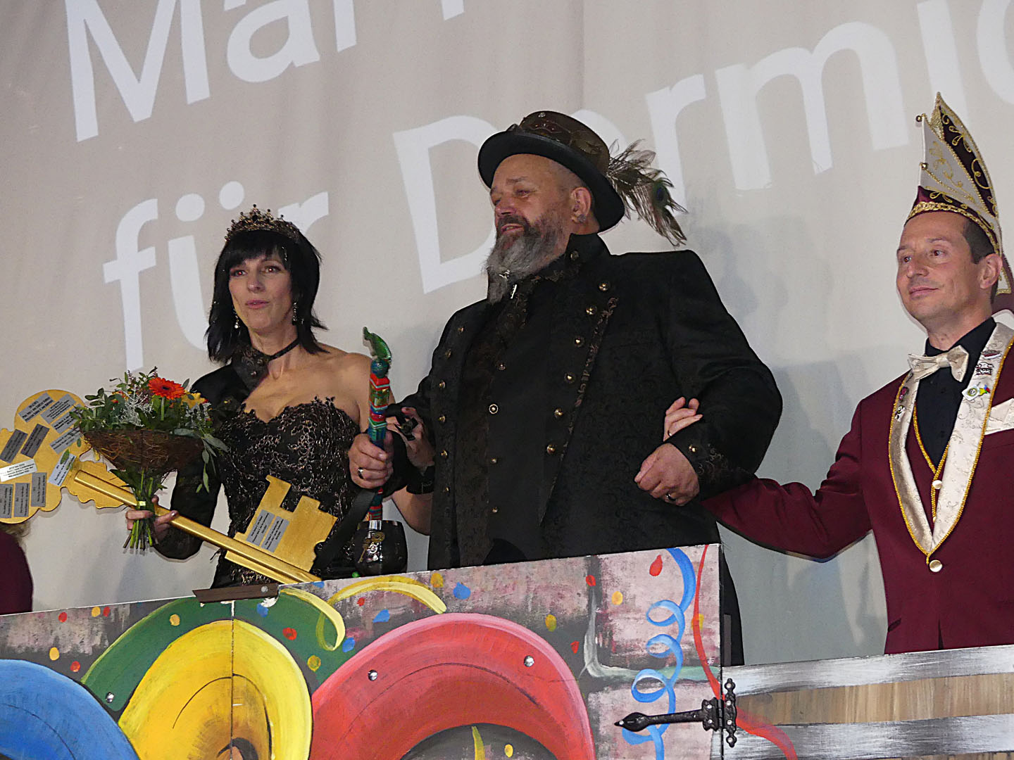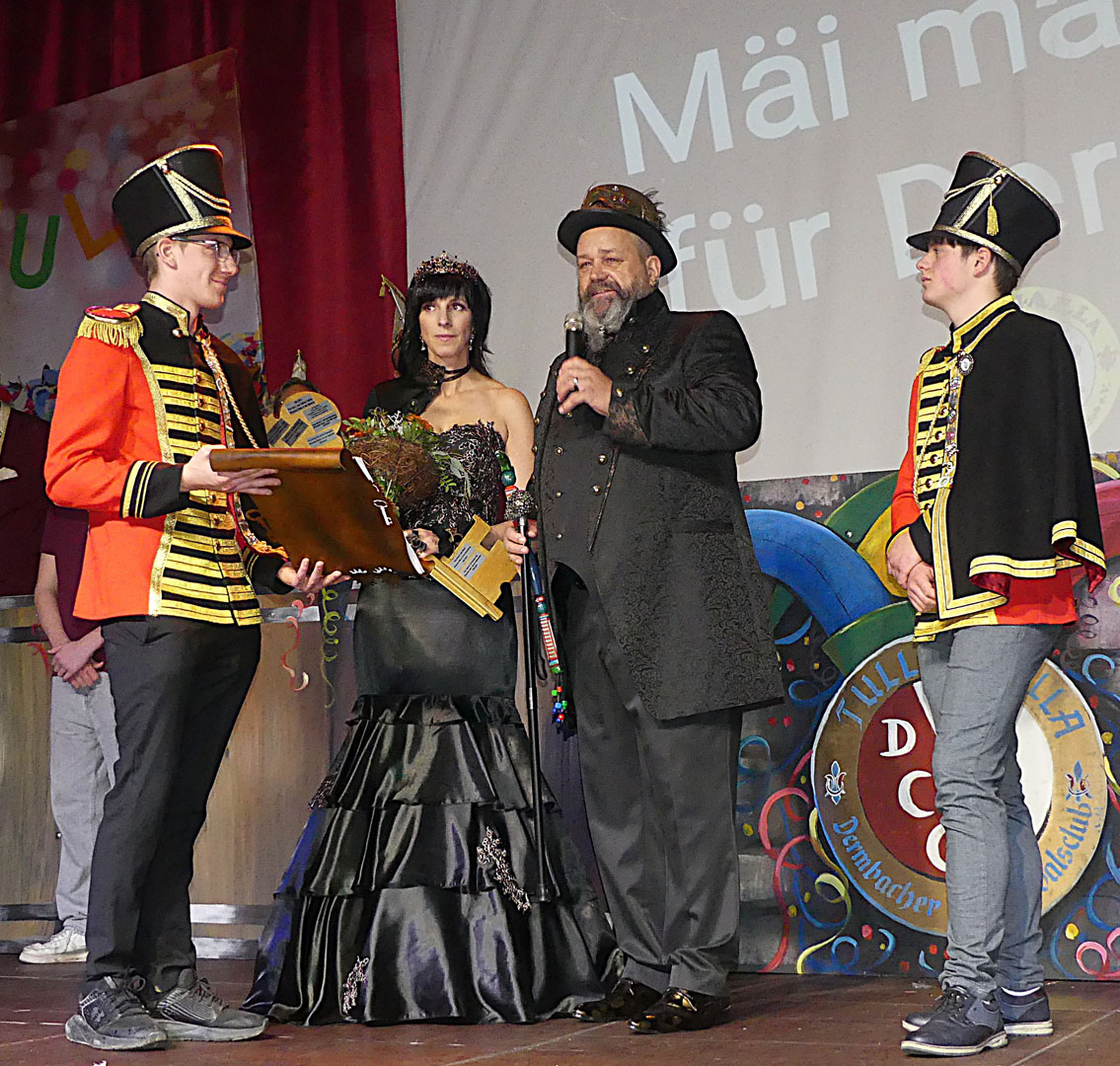 Ein ganz besonderer Höhepunkt war die Vorstellung unseres neuen Prinzenpaares. Mit einem spektakulären Einzug auf Motorrädern, begleitet von rockigen Klängen und Nebeleffekten, präsentierten wir voller Stolz Prinz Henri I. vom Heckicht und Prinzessin Denise II. vom Klambeshof. Die beiden wurden vom Publikum begeistert empfangen, und ihr sympathischer erster Auftritt machte deutlich, dass sie unsere neue Saison mit viel Freude und Energie gestalten werden. Passend dazu stellten wir auch unser Motto vor: „Mäi mâches für Dermich!“ – eine Hommage an die Heimat des neuen Prinzenpaares in den Albadörfern.