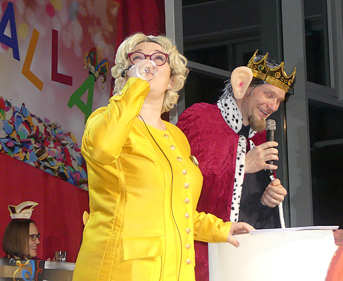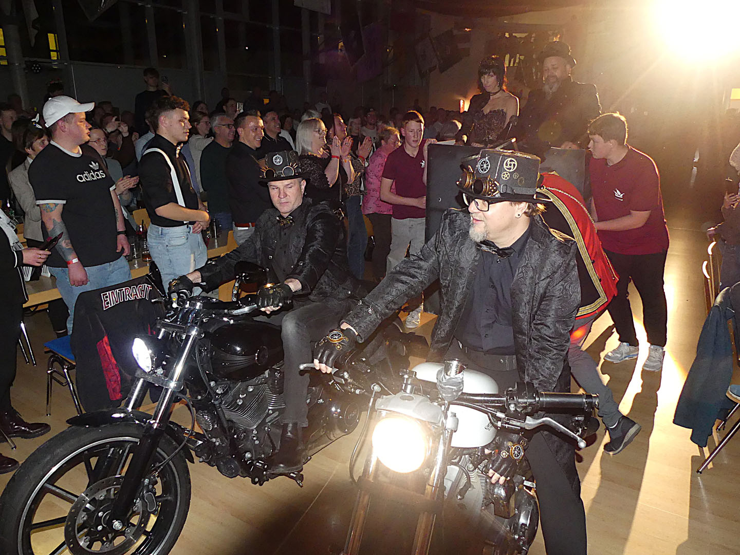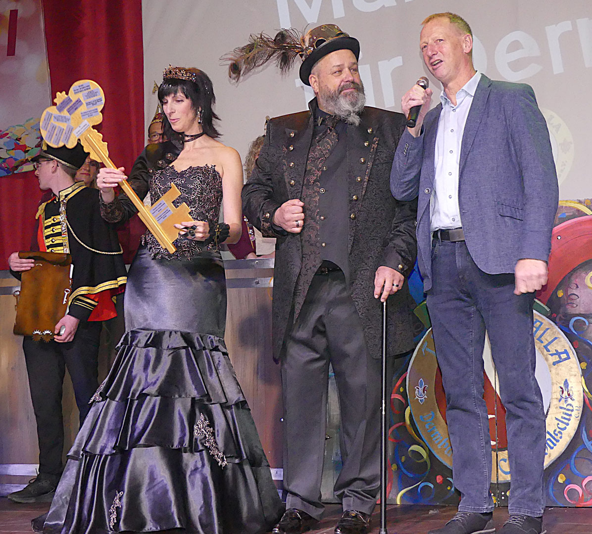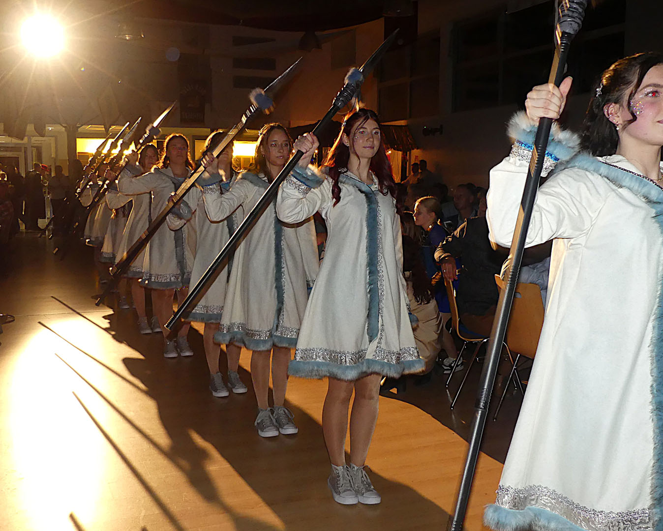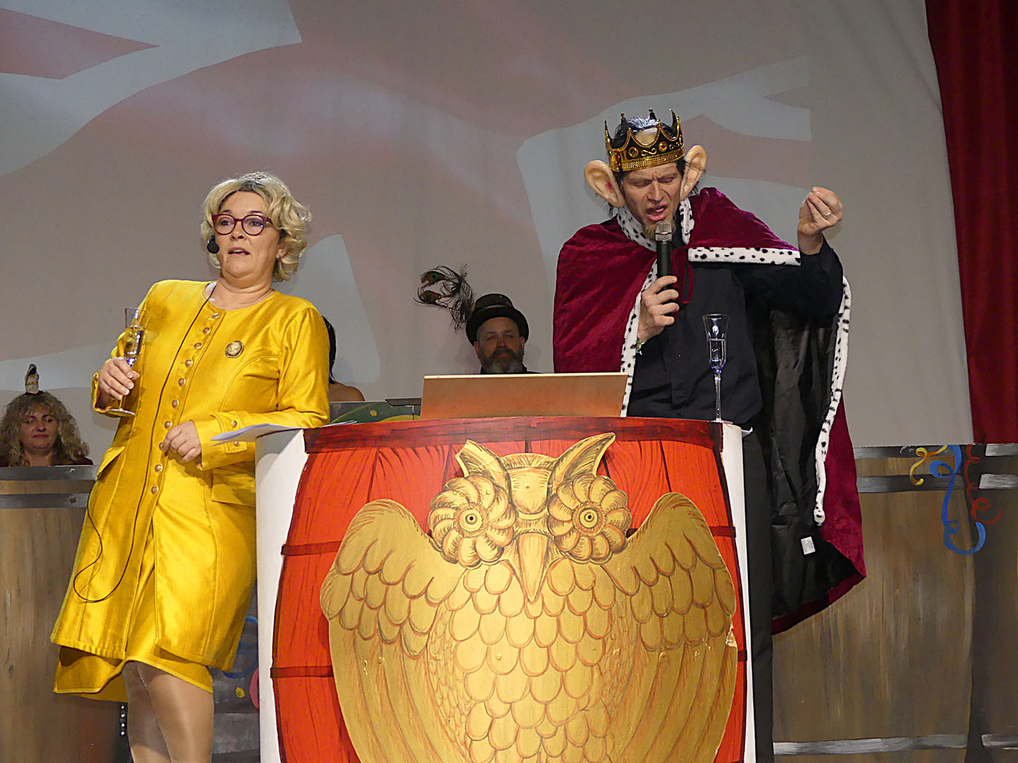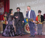 Ein ganz besonderer Höhepunkt war die Vorstellung unseres neuen Prinzenpaares. Mit einem spektakulären Einzug auf Motorrädern, begleitet von rockigen Klängen und Nebeleffekten, präsentierten wir voller Stolz Prinz Henri I. vom Heckicht und Prinzessin Denise II. vom Klambeshof. Die beiden wurden vom Publikum begeistert empfangen, und ihr sympathischer erster Auftritt machte deutlich, dass sie unsere neue Saison mit viel Freude und Energie gestalten werden. Passend dazu stellten wir auch unser Motto vor: „Mäi mâches für Dermich!“ – eine Hommage an die Heimat des neuen Prinzenpaares in den Albadörfern.